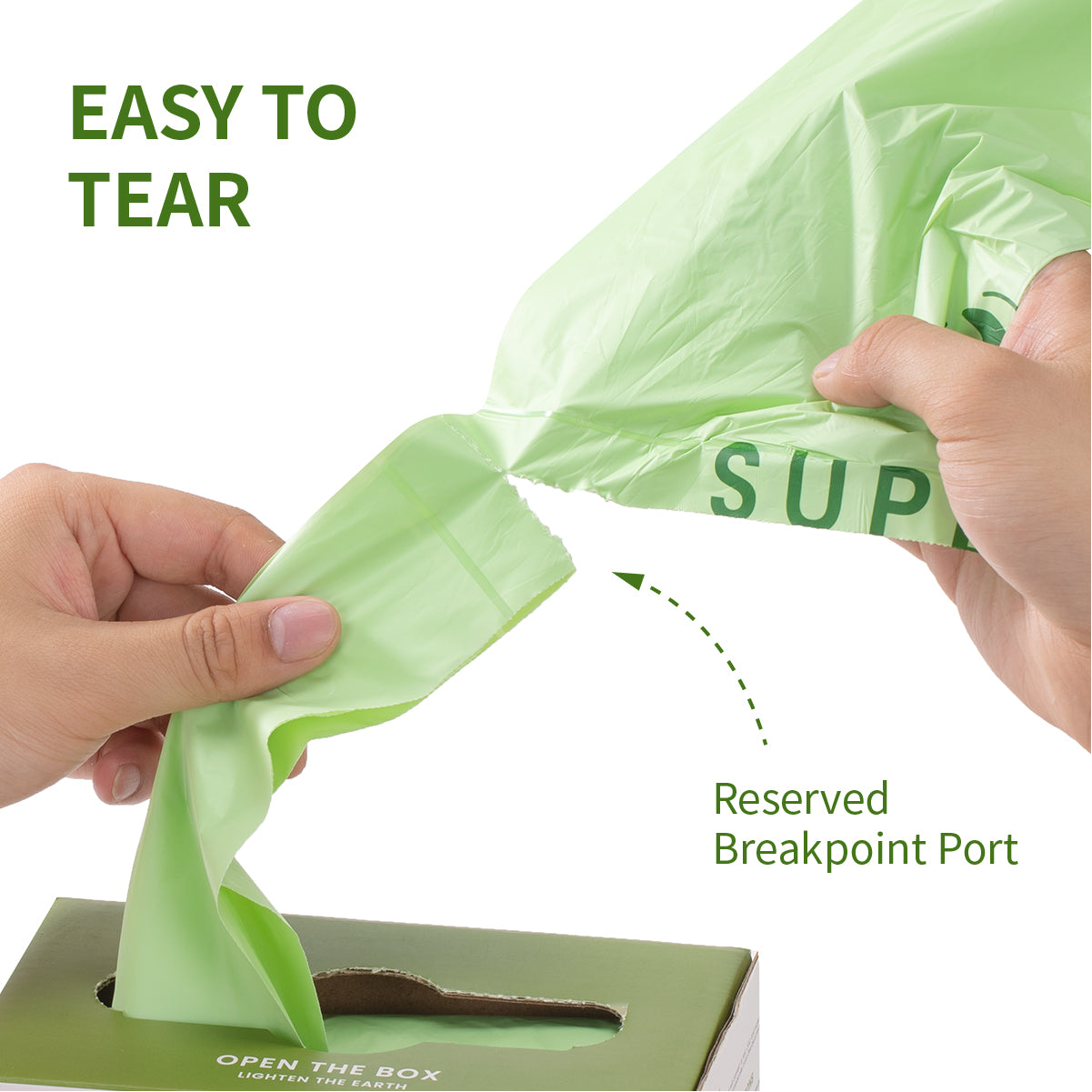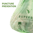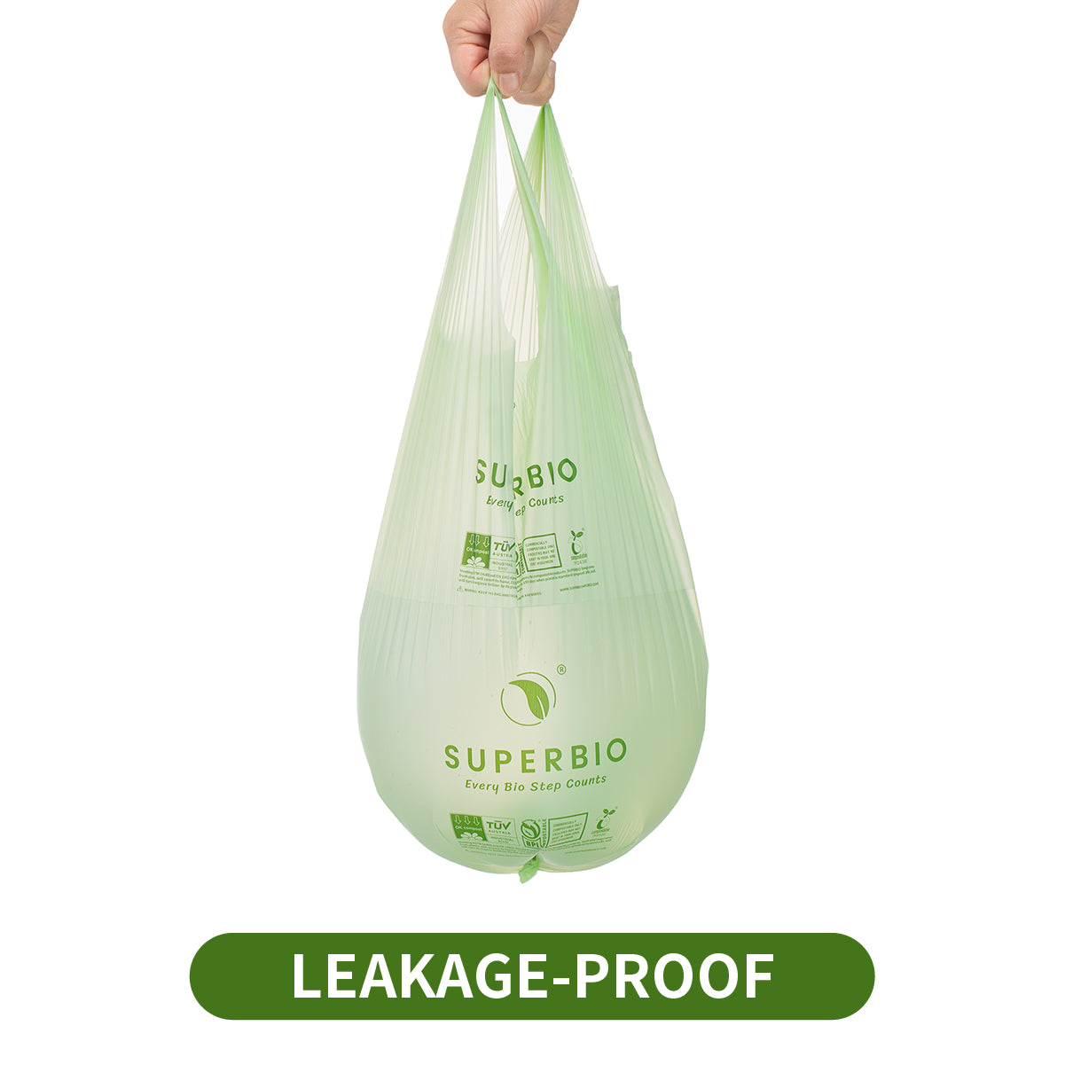 SUPERBIO bags are guaranteed to remain strong, sturdy and tear-proof when used in accordance with the recommended usage directions. Patented processing technologies. Handle tie and star sealed reinforced bottom to securely hold even the heaviest load.